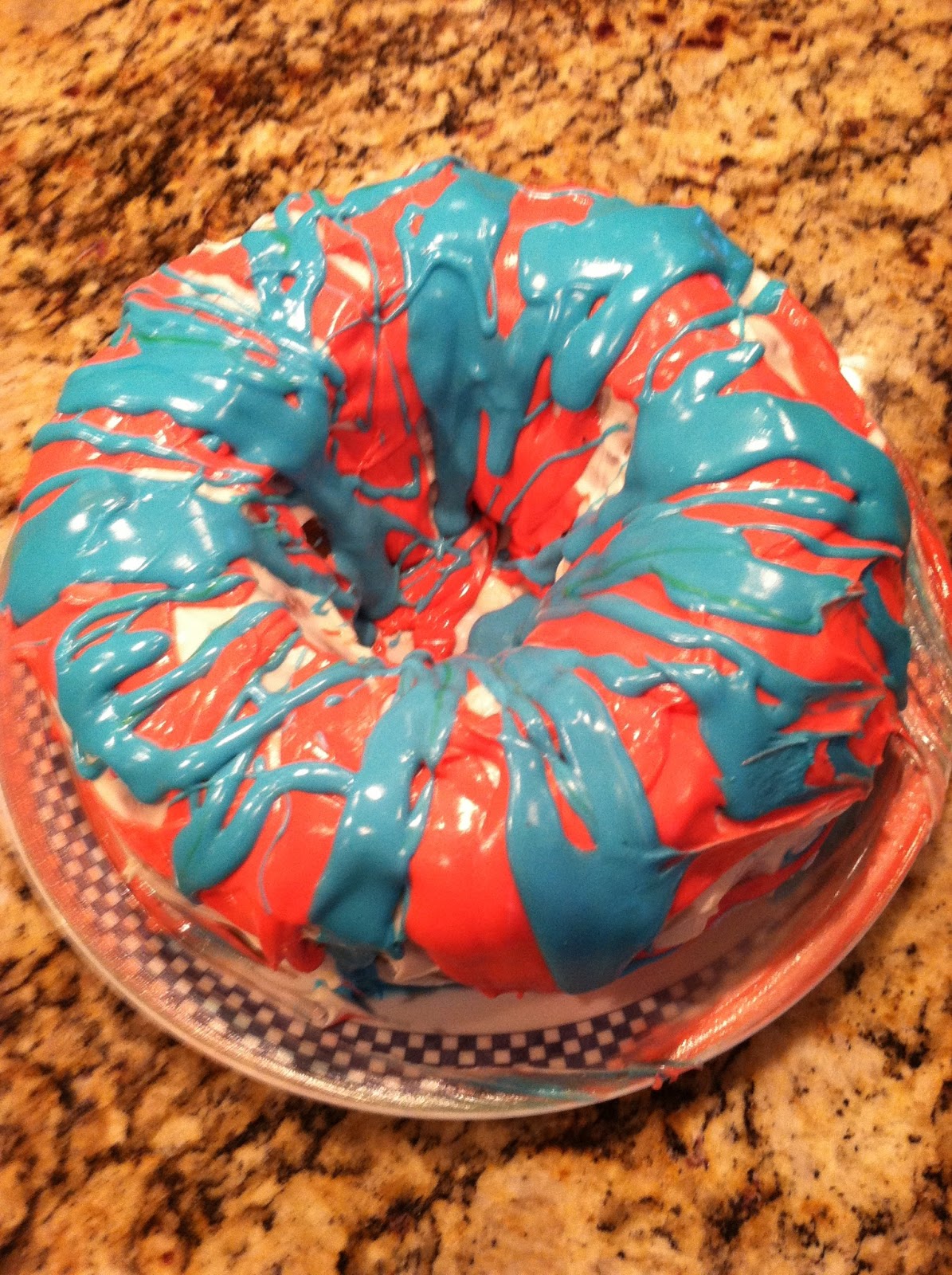 | Oh, random - this was the inside of the cake on the test run. 3 colors. Who am I? Betty Crocker??? Please understand the sarcasm in that statement. I would be voted most unlikely to make a cake for a party ever. But I did. That's some trust from family. |